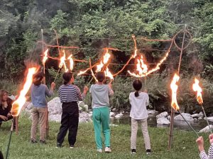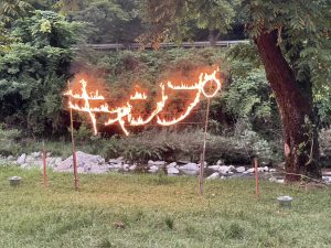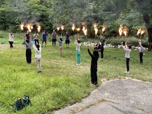 食事を終え、片付けも終えた2日目夜にこちらもメインイベント、キャンプファイヤーと練習してきた出し物披露でしたが、雨が降りそうだったので、少し早目の時間にキャンプファイヤーとトーチを行い、出し物は翌日に延期しました。